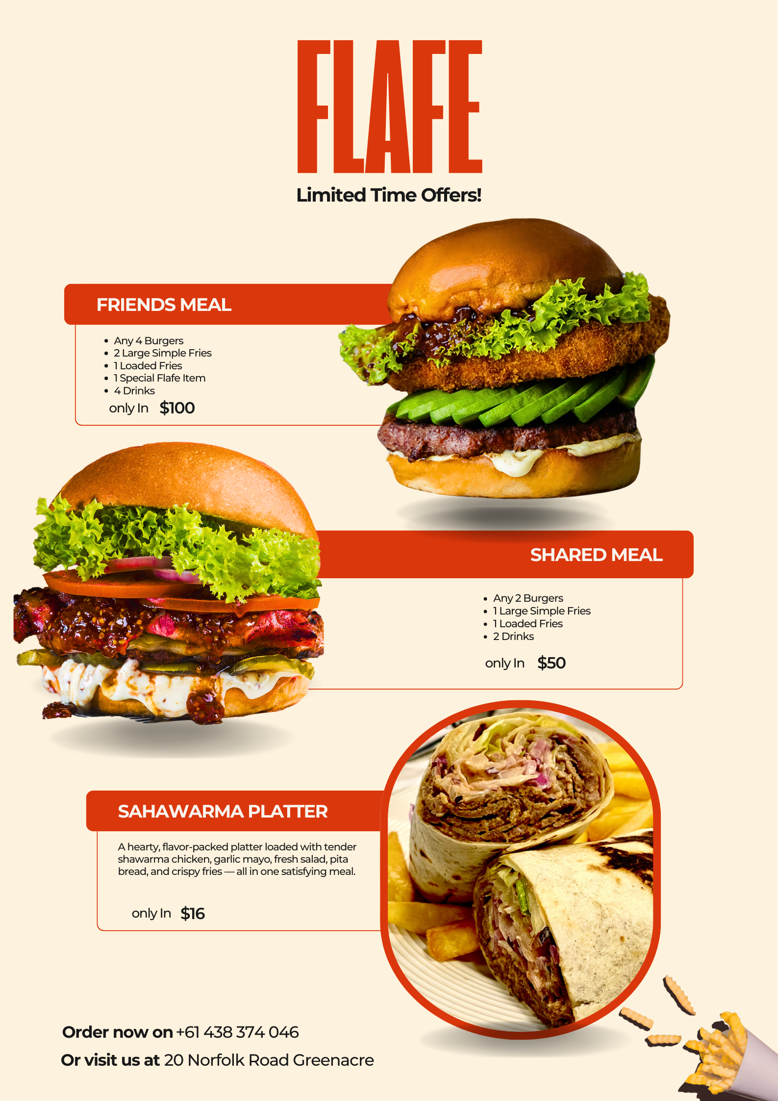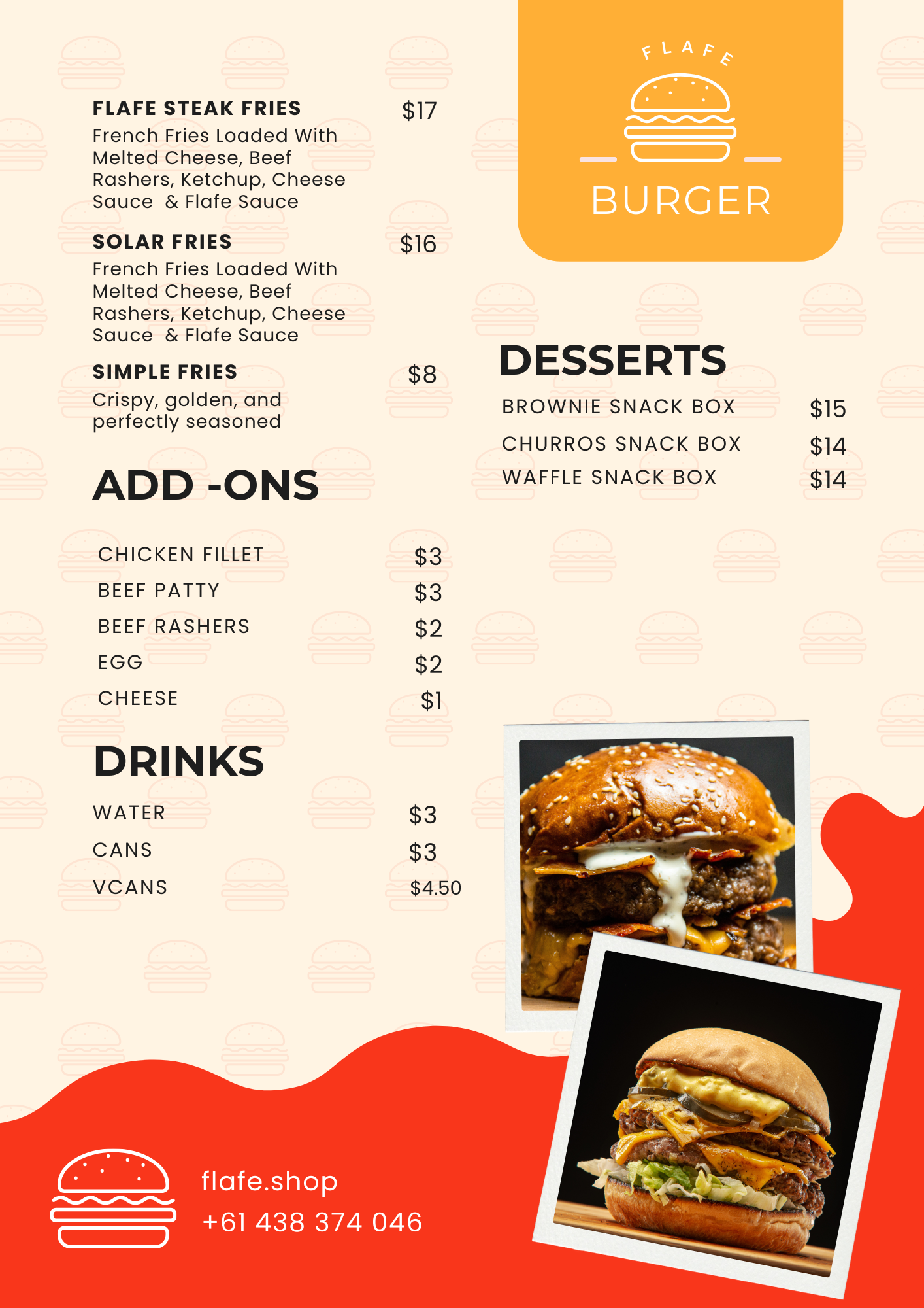 Discover our gourmet burgers, loaded fries, and delicious desserts crafted for your cravings.